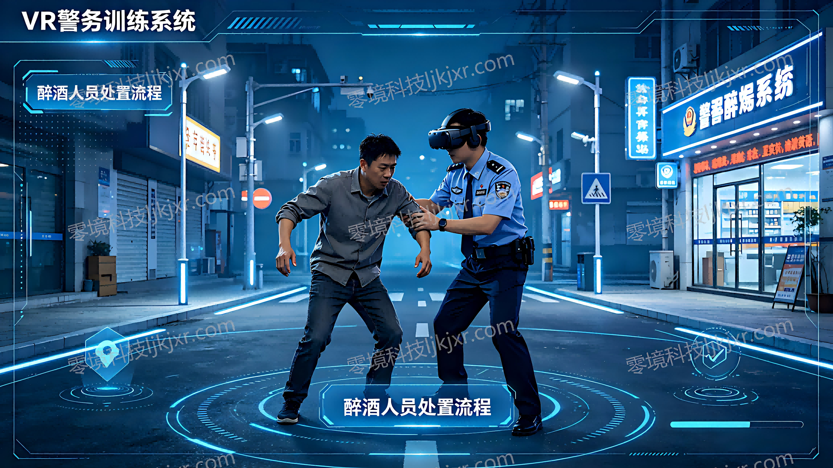 VR 警务训练系统的出现,为这一难题提供了破局之道。民警佩戴 VR 设备,即可 “置身” 深夜街头大排档、KTV 门口等真实场景,面对胡搅蛮缠、拒不配合的醉酒人员,沉浸式体验现场的紧张感。系统内置数十种随机剧情分支,醉酒人员可能突然动手、倒地撒泼或是呼叫同伴起哄,民警需要根据实时状况,规范使用口头制止、徒手控制等处置流程,每一次选择都会触发不同的剧情走向,帮助民警快速积累临场处置经验。